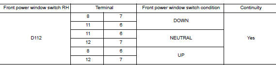 NO >> Replace front power window switch RH. Refer to PWC-65, "Removal and Installation".