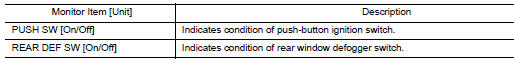 Engine switch (push switch) | IPDM E/R (CAN) | Inputs the push-button ignition switch (push switch) signal and transmits the ignition switch status judged with BCM via CAN communication. |